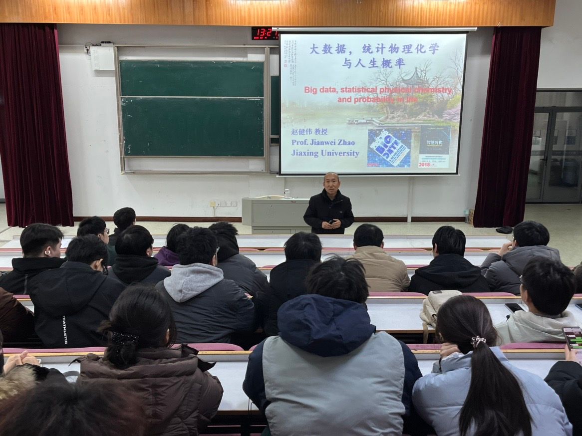 “南湖学者特聘教授”“尖峰团队”学术带头人赵健伟教授主讲,主题为“大数据、统计物理化学和人生概率”,2024级全体研究生参加。