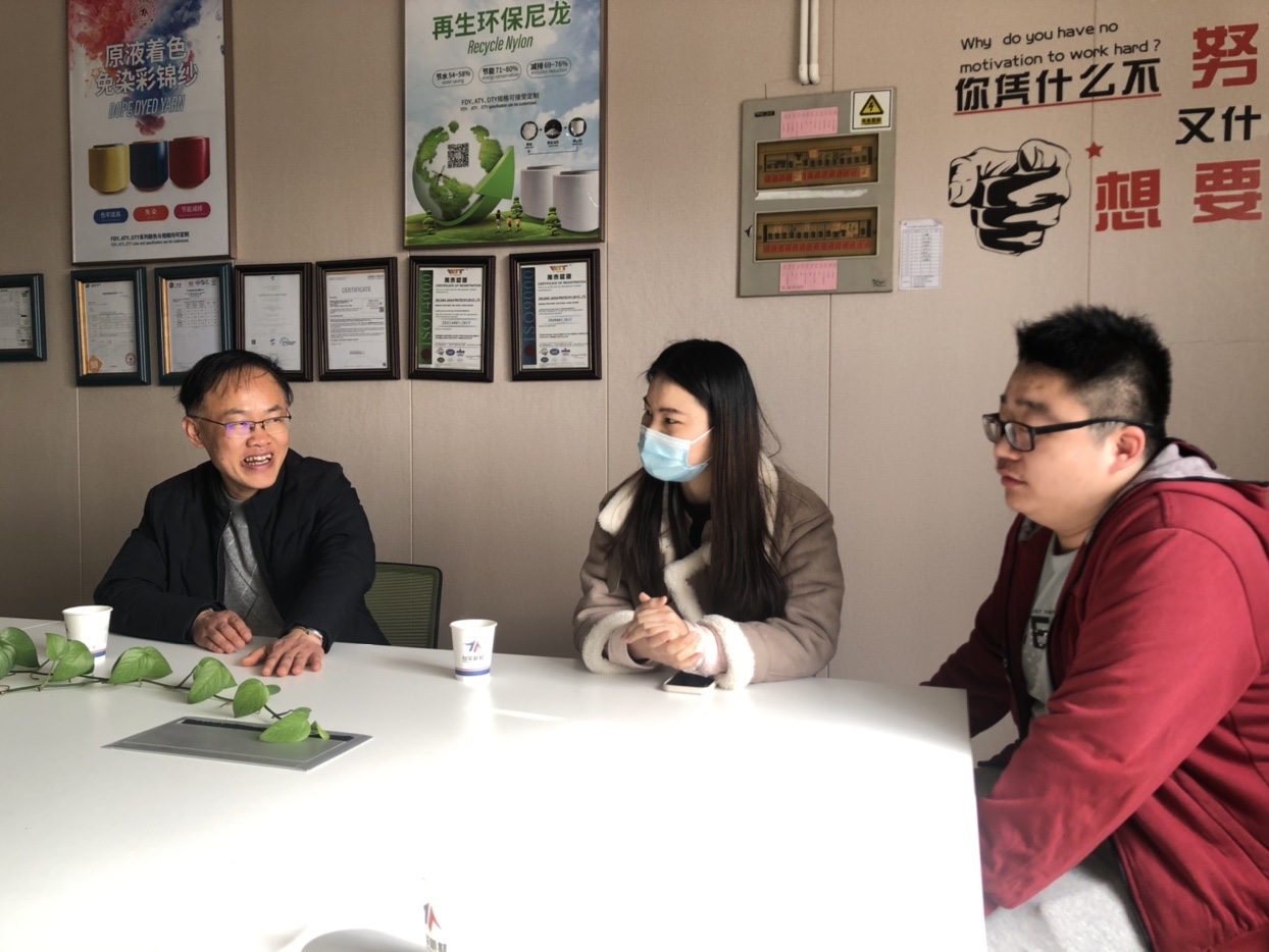 为了推进专业内涵建设,深化校企合作深度,拓宽合作渠道,1月20日上午,材纺学院副院长黄立新、纺织系教师汪蔚及学工办王晓莹老师一行走访校企合作企业——浙江台华新材料股份有限公司,与企业相关负责人共同探讨专业建设。