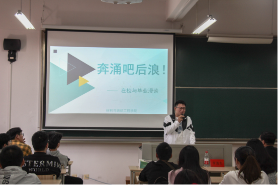 优秀校友报告讲座在14号楼423举办。高分子材料与工程专业2016届毕业生,平罗县金恒炭素有限公司执行董事兼总经理,宁夏北鱼科技软件有限公司合作创始人赵玄理应邀为我院学生做了题为“奔涌吧后浪”的报告讲座,分享励志故事,交流创业体会,畅谈人生感悟。