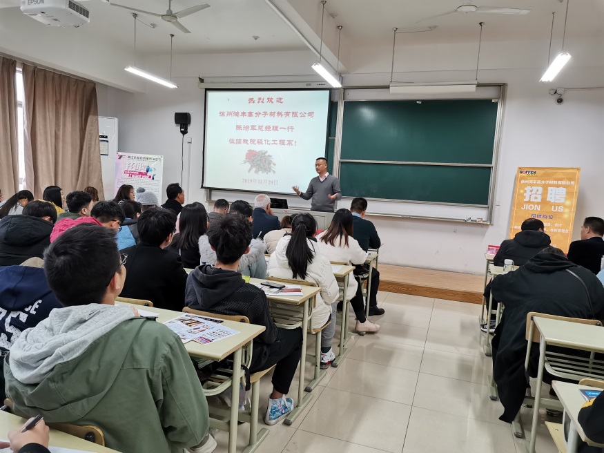 应我院轻化工程系的邀请,徐州鸿丰高分子材料有限公司陈治军总经理一行于11月29日访问我院轻化工程系,随行有李林高工、陈祖武经理、Jesus先生、LUCA先生、陈小亮主任,以及浙江永发合成革有限公司王新才总经理一行。轻化工程系全体老师、轻化(实验)161、轻化(实验)191班全体同学参加了本次活动。该活动由轻化工程系主任罗建勋主持。