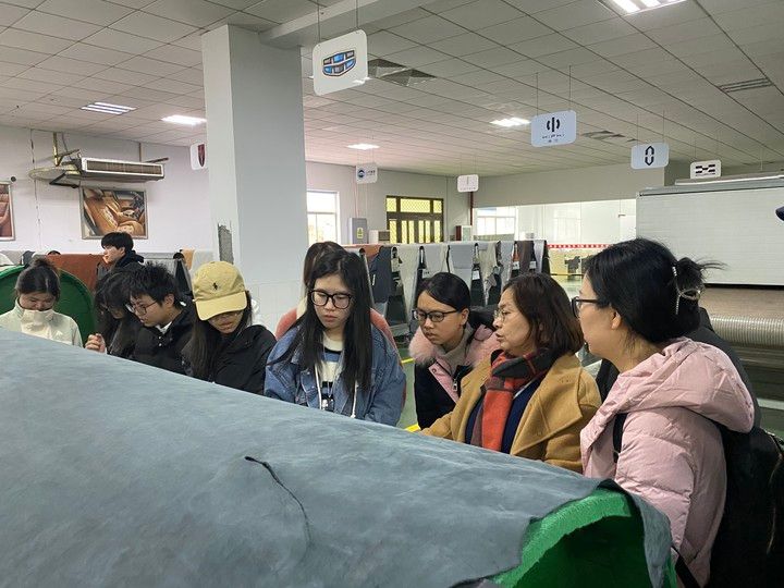 在明新旭腾新材料股份有限公司,人事部陈蕾经理向大家介绍公司情况并和相关负责人带领师生们参观了涂饰车间、裁片车间、检测中心和研发中心,详细介绍了革坯性质、工艺流程、生产设备及检测方法等。在浙江富卡科技有限公司,负责人介绍并引导师生参观了皮革生产中的整饰工段、质量检测、研发中心、汽车坐垫革裁片、打孔等。在浙江格莱美服装有限公司,学生体验了以时尚皮革服装为代表的皮革制品的生产过程及成品。