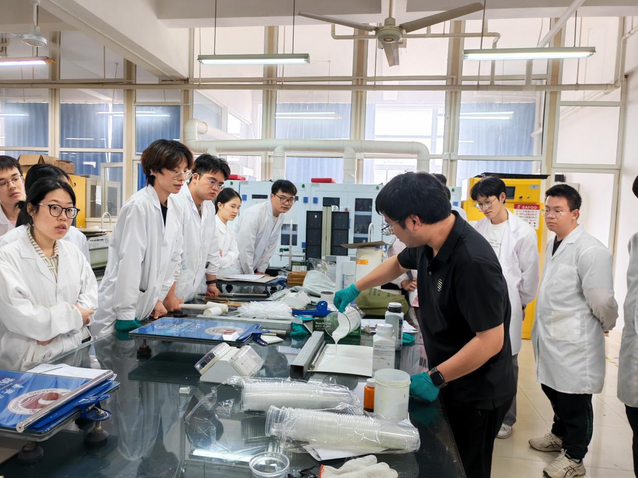 郭祥经理就“合成革表面处理技术”进行讲解,内容包括涂料的发展史、分类和作用、表面处理剂的组成、表面处理的方法及影响因素等,将专业理论与市场应用有机融合。夏敏经理一行以“合成革干法与表面处理技术”为主要内容进行讲解,指导学生们制作出一张张精美的生态合成革,融理论、实践、市场为一体。