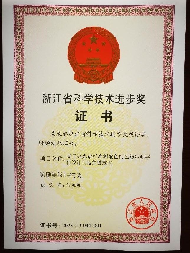 我院沈加加教授与浙江理工大学、浙江厚源纺织股份有限公司、浙江理工大学上虞工业技术研究院有限公司共同合作完成的“基于高光谱纤维测配色的色纺纱数字化设计制造关键技术”荣获省科技进步奖三等奖,该奖项兔子先生 为第一完成人