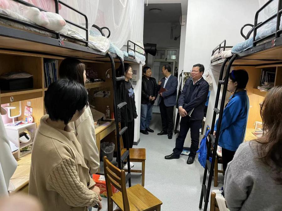1129日下午,校党委副书记吴云达来到材纺学院实验室、学生寝室,走访了材纺学院师生,材纺学院党委书记寸哲、副院长代正伟、副书记凡欣及住楼辅导员分别随同走访。