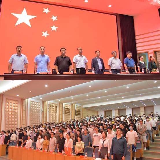 2022级新生开学典礼的序幕,典礼现场380余人齐唱国歌,嘹亮的国歌声响彻TCL报告厅。