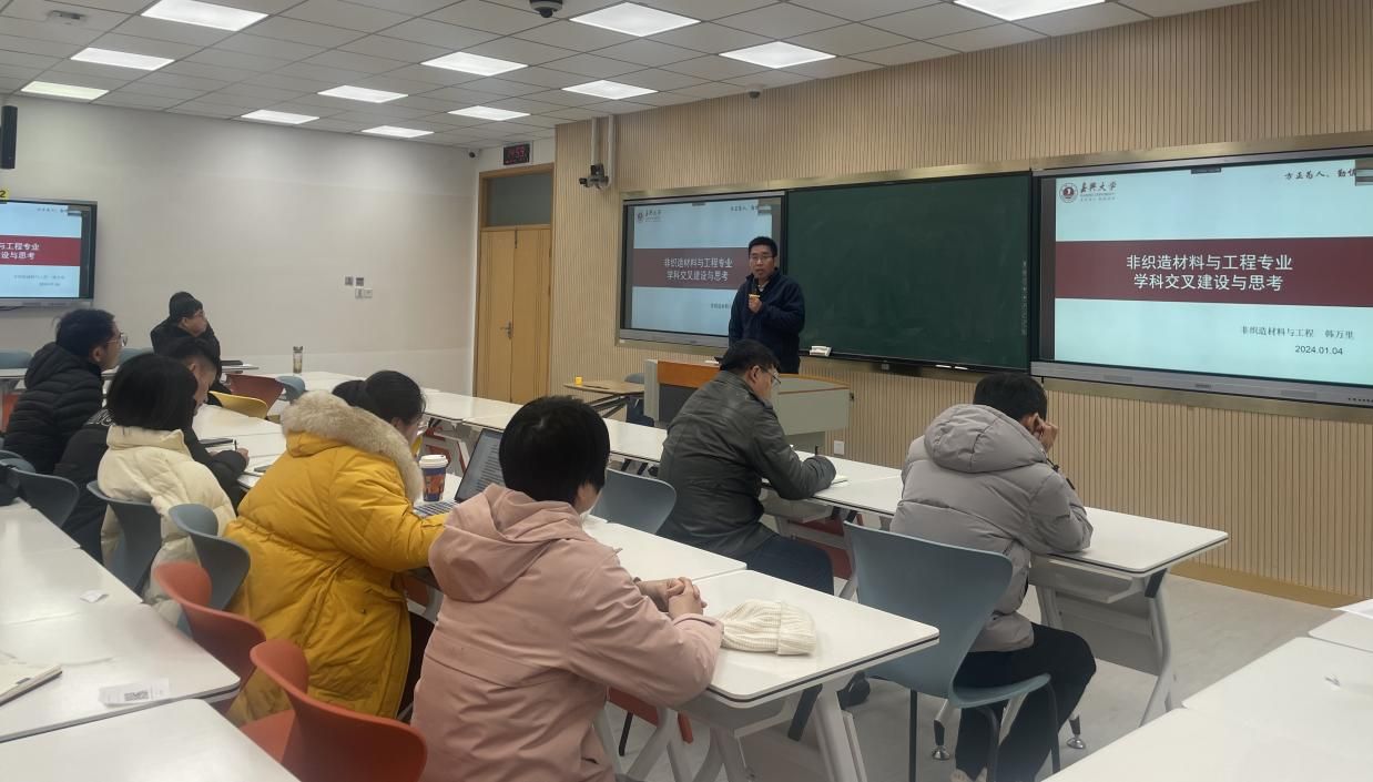 韩万里老师作“非织造材料与工程专业学科交叉建设与思考”分享,围绕非织造材料与工程专业学科交叉特色,从课程资源建设、师资队伍建设两个角度详细介绍建设经验,并展示了该专业目前建设成效以及后续建设计划。