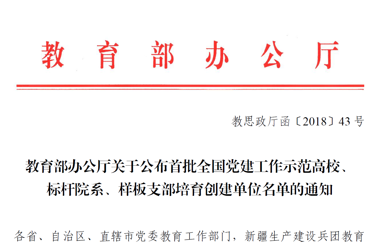 近日,国家教育部办公厅公布了首批全国党建工作示范高校、标杆院系、样板支部培育创建单位名单。我院教工第二党支部入选“全国党建工作样板支部”培育创建单位。