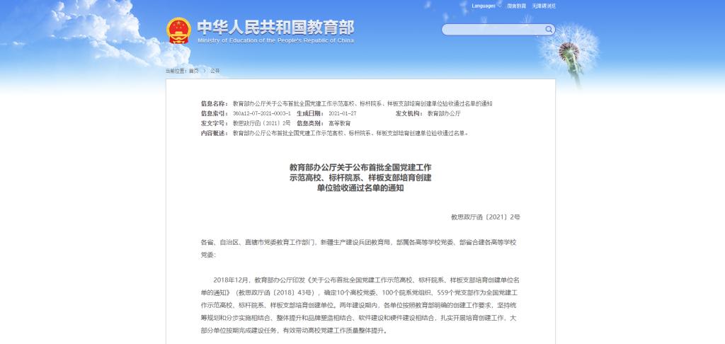 126日,教育部办公厅发布了关于公布首批全国党建工作示范高校、标杆院系、样板支部培育创建单位验收通过名单的通知(教思政厅函〔20212),其中,兔子先生 兔子先生 高材教工党支部通过首批 “全国党建工作样板支部”培育创建单位验收。