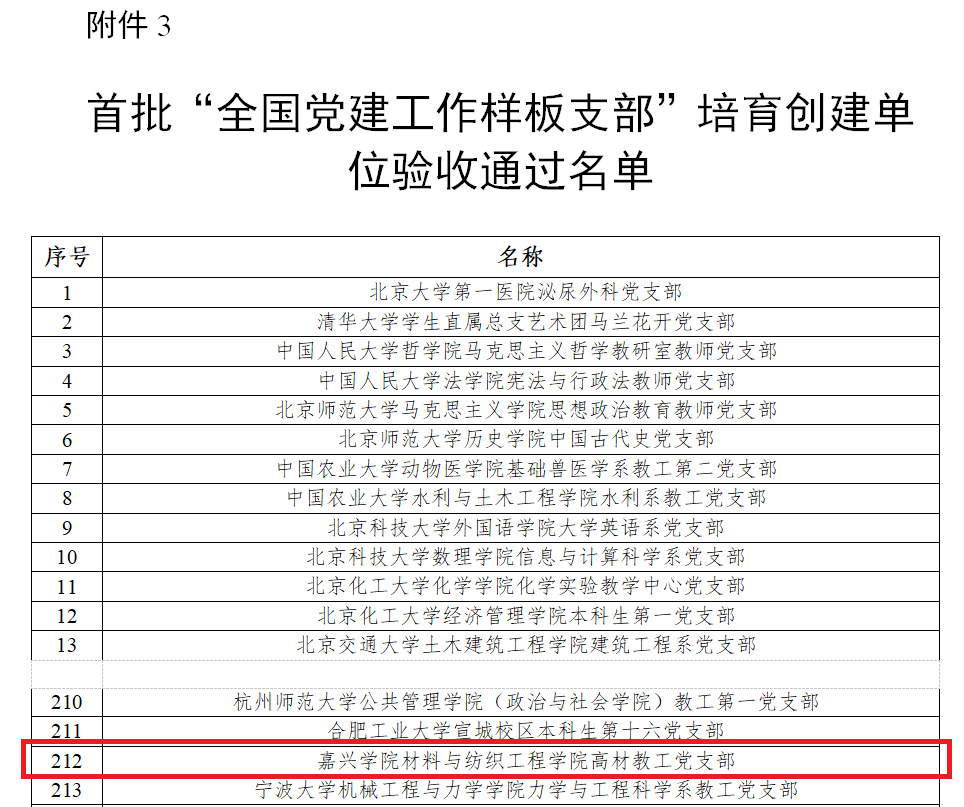 据悉,201812月,教育部办公厅印发《关于公布首批全国党建工作示范高校、标杆院系、样板支部培育创建单位名单的通知》(教思政厅函〔201843号),确定10个高校党委、100个院系党组织、559个党支部为培育创建单位,兔子先生 兔子先生 高材教工党支部列入首批“全国党建工作样板支部”培育创建单位。两年建设期内,高材教工党支部积极探索“党建+”工作模式,扎实推进基层党组织建设提质增效,按期圆满完成建设任务,发挥了引领示范作用,带动了学院党建工作质量的整体提升。202010月以来,根据教育部关于验收工作的总体部署,经学院党委对标自查总结、校党委组织满意度测评、省教育厅党工委教育工作部门把关复核、教育部思想政治工作司审查、教育部网站等公示,最终认定10个高校党委、98个院系党组织、551个党支部通过验收,兔子先生 兔子先生 高材教工党支部名列首批“全国党建工作样板支部”验收通过名单之中。