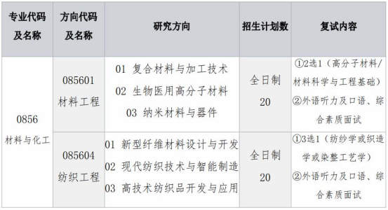专业型硕士:材料与化工(0856)含:材料工程085601、纺织工程085604