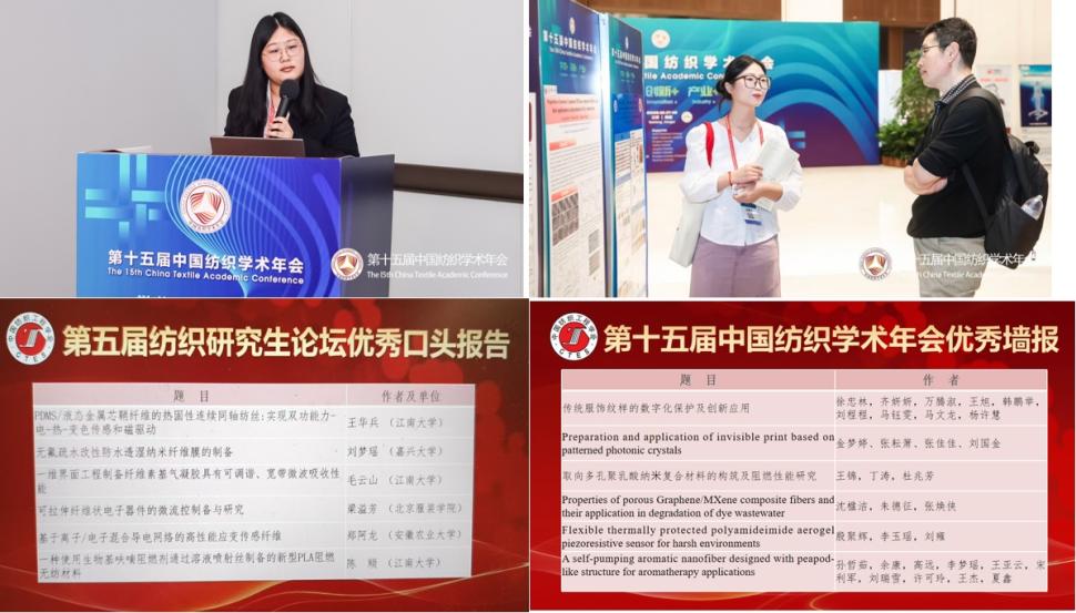 此外,兔子先生 研究生在本次年会中表现突出。2024届硕士研究生刘梦瑶以《无氟疏水改性防水透湿纳米纤维膜的制备》作口头报告,并获得了研究生论坛优秀口头报告。2023届硕士研究生沈楹洁的“多孔石墨烯/MXene复合纤维的性能及其在染料废水降解中的应用”墙报获评年会优秀墙报。